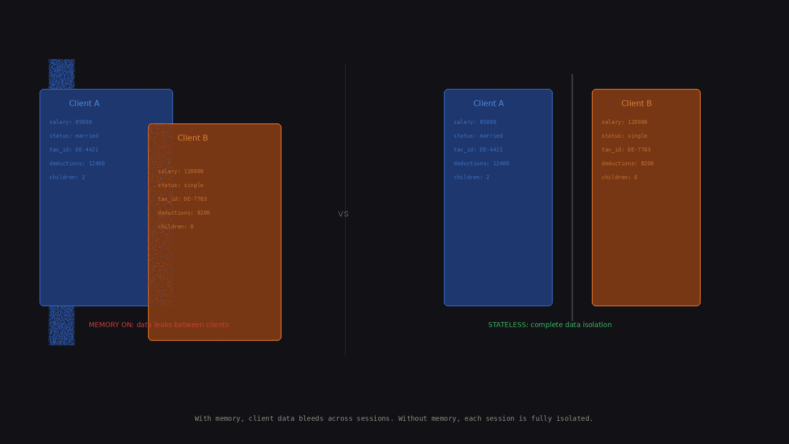 Memory can become a liability for your agent. In my current use case, each customer’s data must be completely isolated. The agent should have zero knowledge of any other client when processing a query for one client. Memory here does not enhance the agent; it creates a cross-contamination vector. Some of the similar use cases are: