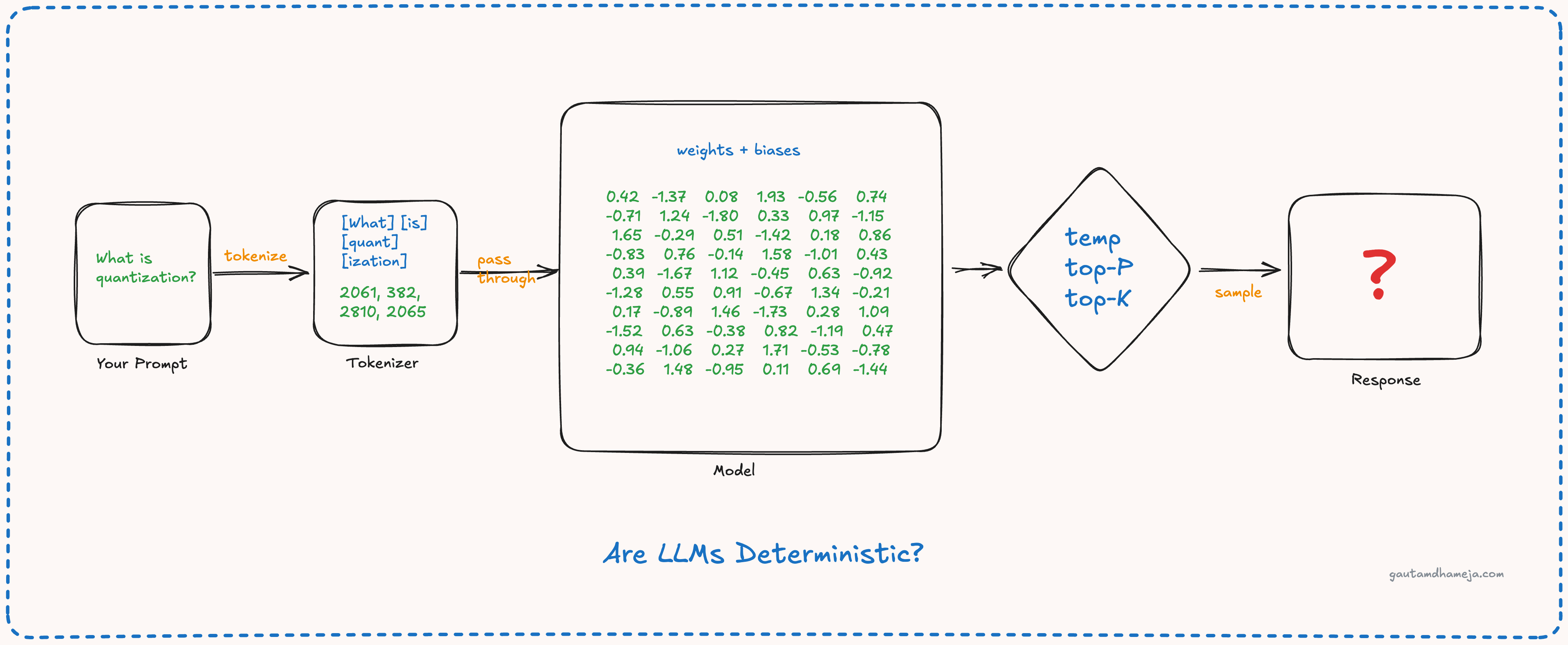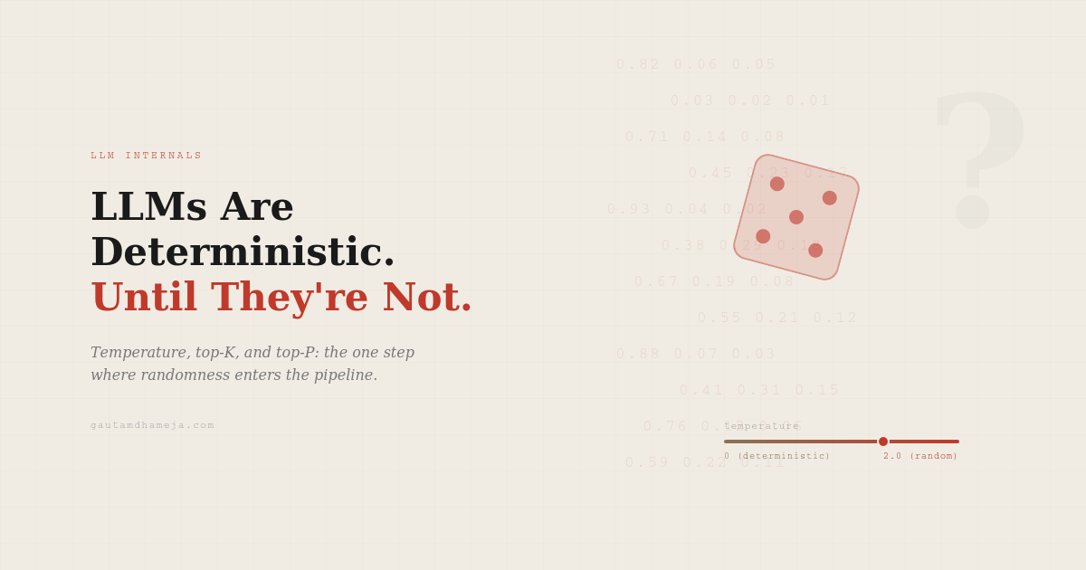 Now, when you run the model, these fixed numbers are loaded in the GPU memory as a large matrix. When you send your query, that also gets tokenized deterministically into fixed token ids and embedding vectors. When you multiply these vectors with fixed model weights, you will get fixed results (apart from the effects of floating point mathematics). The matrix multiplication produces a set of logits, which are raw scores for every token in the model’s vocabulary. Then the softmax function is applied to the logits to create a probability distribution of possible next tokens. So far, everything looks deterministic. Then what’s the catch?