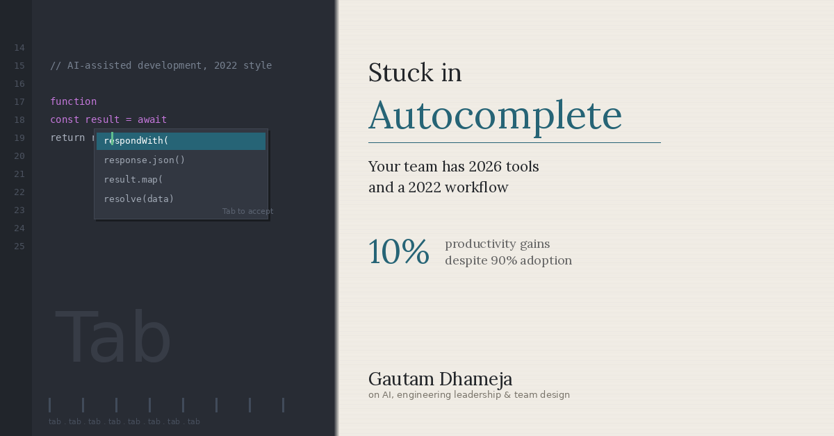 The stuck in auto-complete problem isn’t just about tool adoption. It’s about whether developers have been trained to work at the level of abstraction these tools require. If you are an engineering leader and your team is using 2026 tools with a 2022 mindset, the gap isn’t your tooling budget. It’s your enablement strategy.
